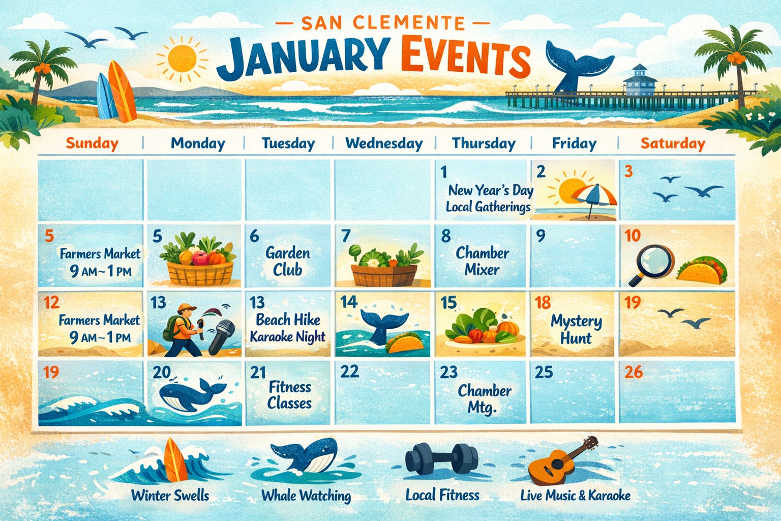 From Sunday strolls at the Farmers Market and scenic beach hikes to whale watching, karaoke nights, Taco Tuesday specials, and community mixers, January is full of low-key, local fun.